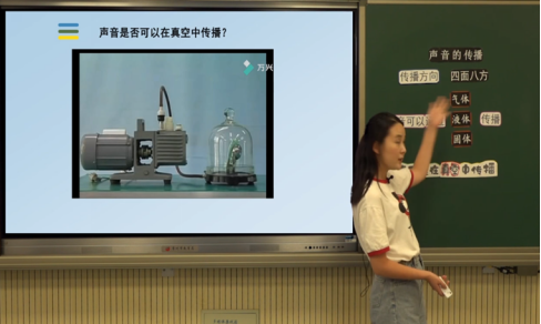 学生回答:有空气时和抽去空气的条件下,铃声的变化,体会声音的传播需要介质,以及声音能在空气中传播。